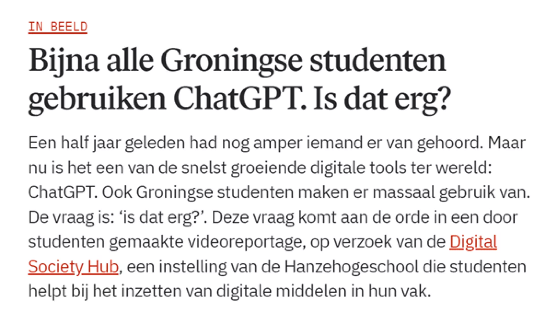 Het afgelopen onderwijsjaar was de Hanze DSH veelvuldig aanwezig op social media (Twitter (X), Instagram, LinkedIn & TikTok). Daarnaast zijn alle nieuwsberichten te vinden via de website www.digitalsocietyhub.nl en www.hanze.nl/dsh.